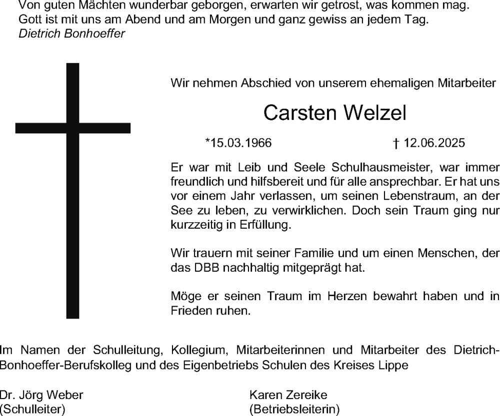 Hier finden Sie Anzeigen aus der Lippischen Landes-Zeitung, die für Carsten Welzel erschienen sind.