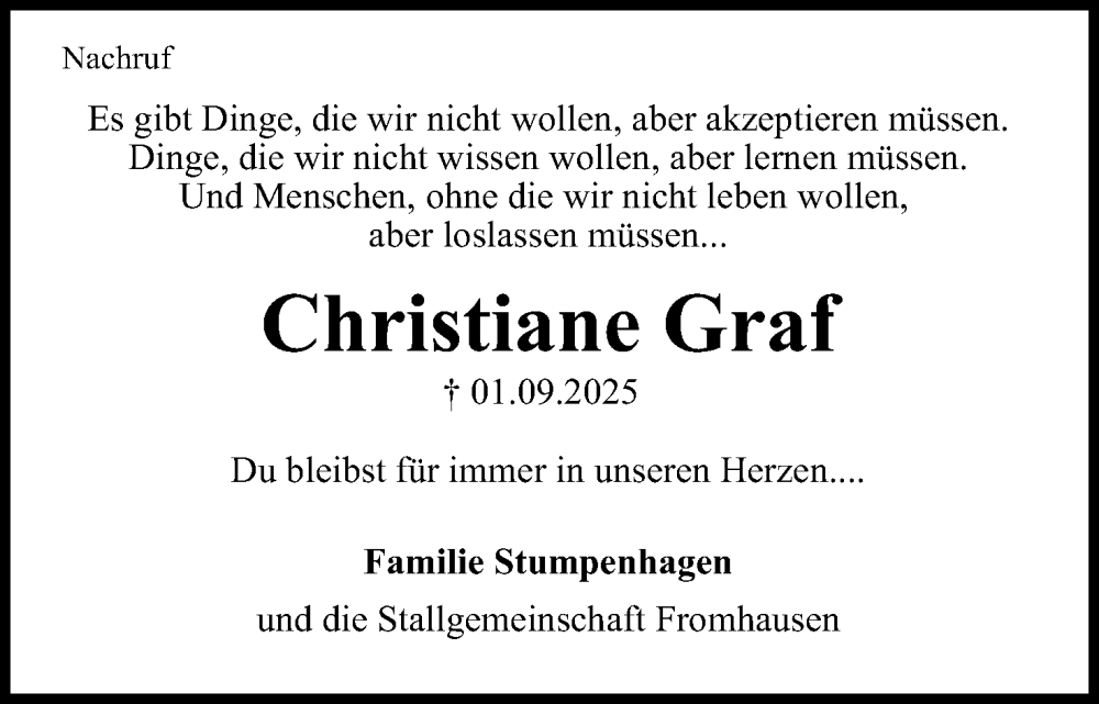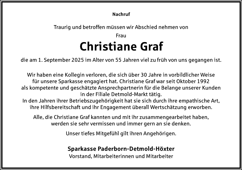 Hier finden Sie Anzeigen aus der Lippischen Landes-Zeitung, die für Christiane Graf erschienen sind.