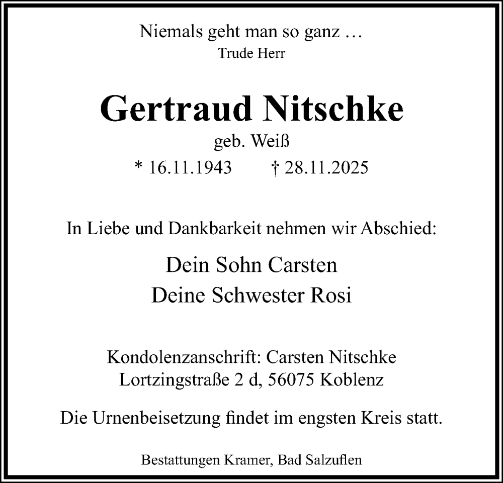 Hier finden Sie Anzeigen aus der Lippischen Landes-Zeitung, die für Gertraud Nitschke erschienen sind.