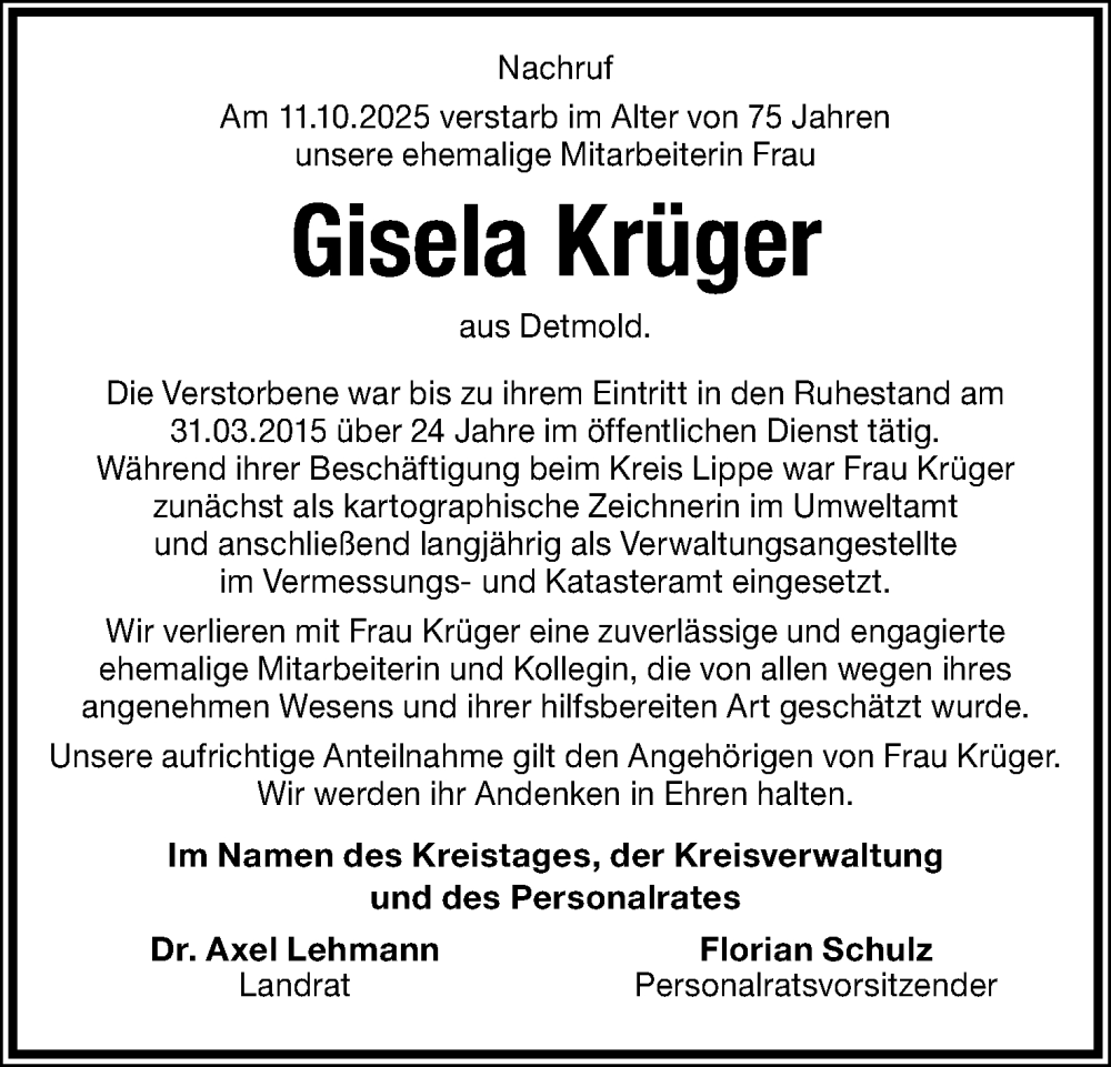 Hier finden Sie Anzeigen aus der Lippischen Landes-Zeitung, die für Gisela Krüger erschienen sind.