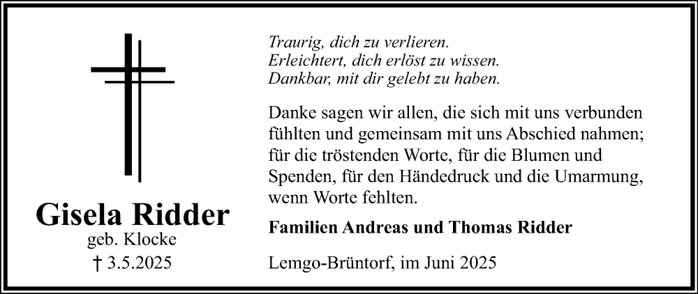 Hier finden Sie Anzeigen aus der Lippischen Landes-Zeitung, die für Gisela Ridder erschienen sind.