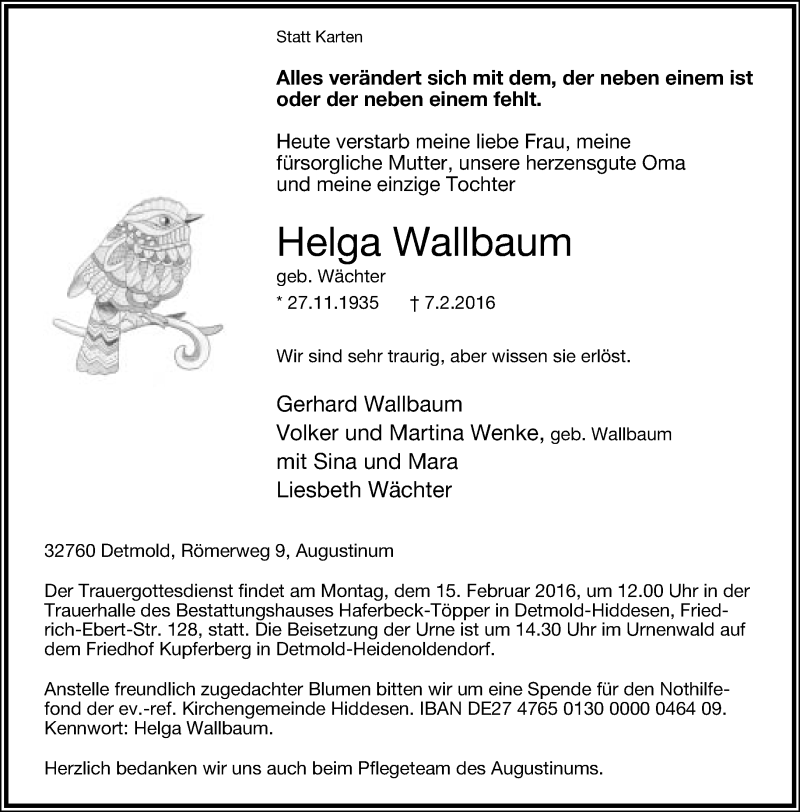 Hier finden Sie Anzeigen aus der Lippischen Landes-Zeitung, die für Helga Wallbaum erschienen sind.