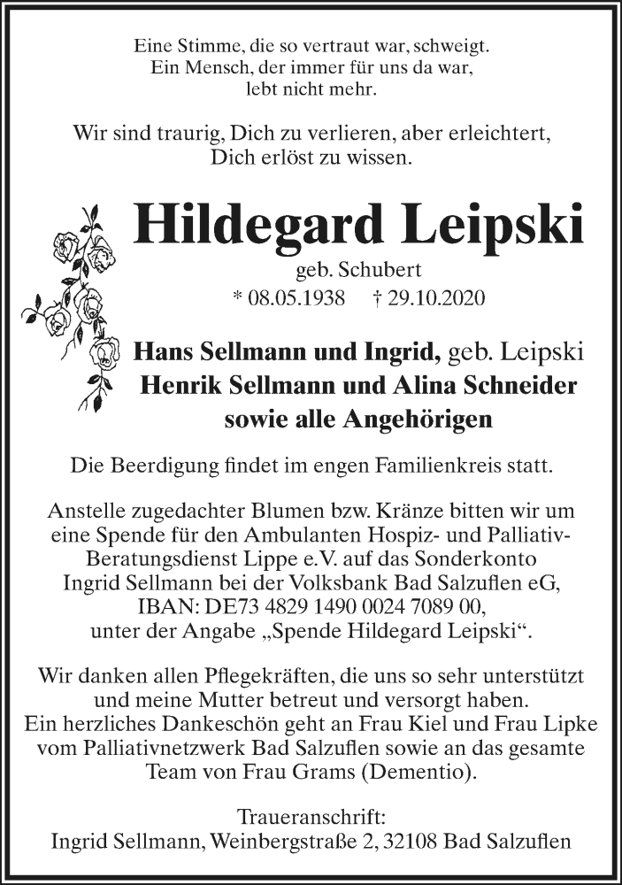 Hier finden Sie Anzeigen aus der Lippischen Landes-Zeitung, die für Hildegard Leipski erschienen sind.