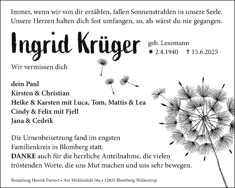 Hier finden Sie Anzeigen aus der Lippischen Landes-Zeitung, die für Ingrid Krüger erschienen sind.