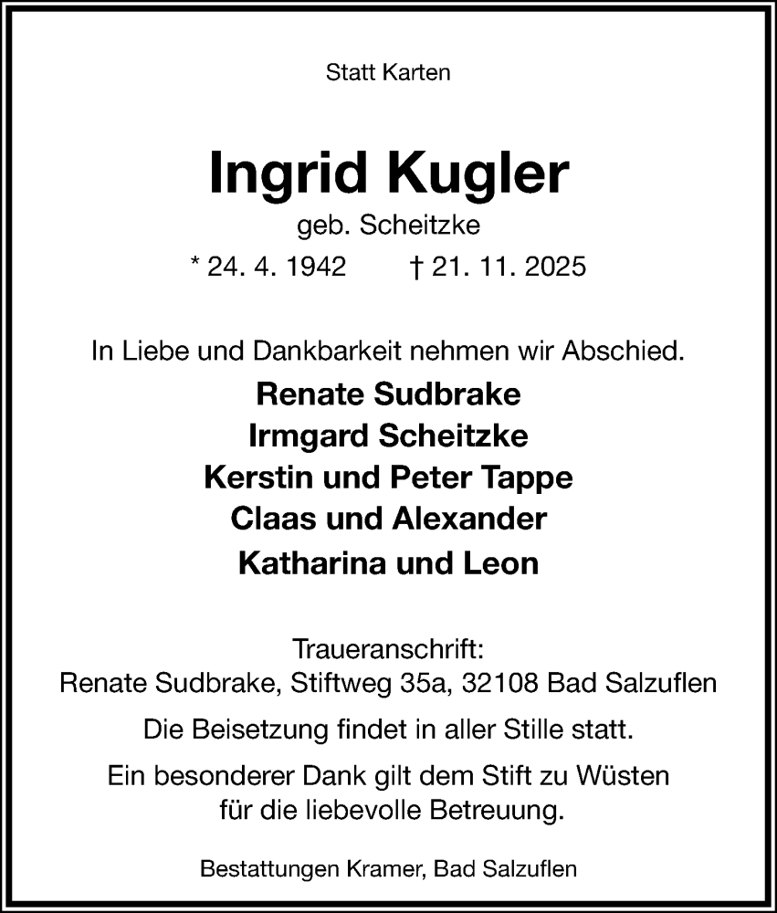 Hier finden Sie Anzeigen aus der Lippischen Landes-Zeitung, die für Ingrid Kugler erschienen sind.