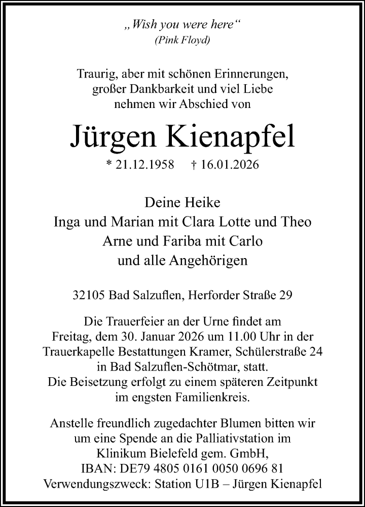 Hier finden Sie Anzeigen aus der Lippischen Landes-Zeitung, die für Jürgen Kienapfel erschienen sind.