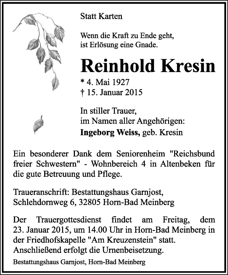 Hier finden Sie Anzeigen aus der Lippischen Landes-Zeitung, die für Reinhold Kresin erschienen sind.