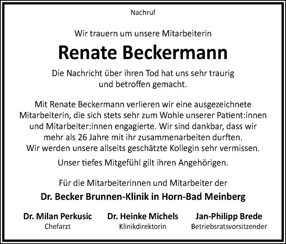Hier finden Sie Anzeigen aus der Lippischen Landes-Zeitung, die für Renate Beckermann erschienen sind.