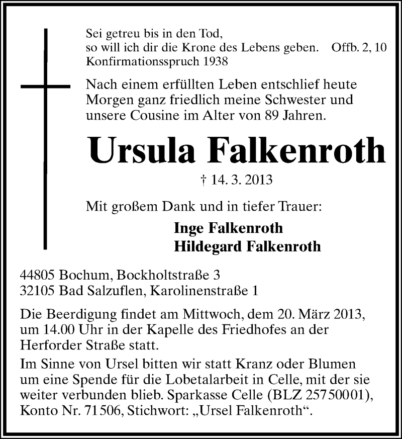 Hier finden Sie Anzeigen aus der Lippischen Landes-Zeitung, die für Ursula Falkenroth erschienen sind.