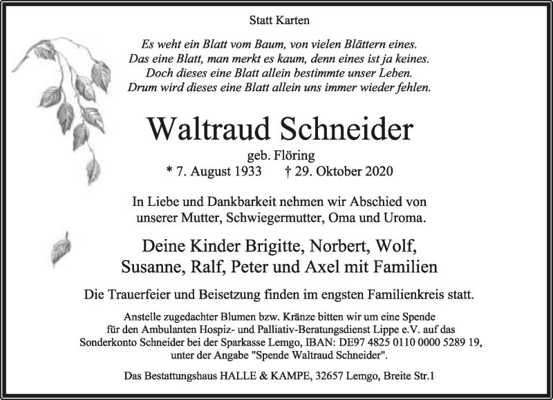 Hier finden Sie Anzeigen aus der Lippischen Landes-Zeitung, die für Waltraud Schneider erschienen sind.